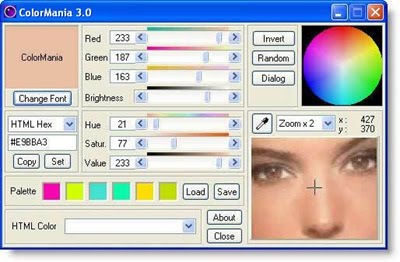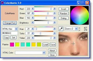 ColorMania é um utilitário gratuito especialmente desenvolvido para web-designers, artistas gráficos e desenvolvedores de aplicativos. Sua função principal é a de selecionar e capturar o código das cores em qualquer tela ou imagem, e tudo com uma máxima precisão. O programa trabalha com cores de diversos formatos como CMYK, RGB, CMY, etc. é possível criar e salvar sua própria paleta de cores, possui zoom, gera o código HTML da cor e é muito fácil de usar, basta posicionar o rato a figura e está feito.